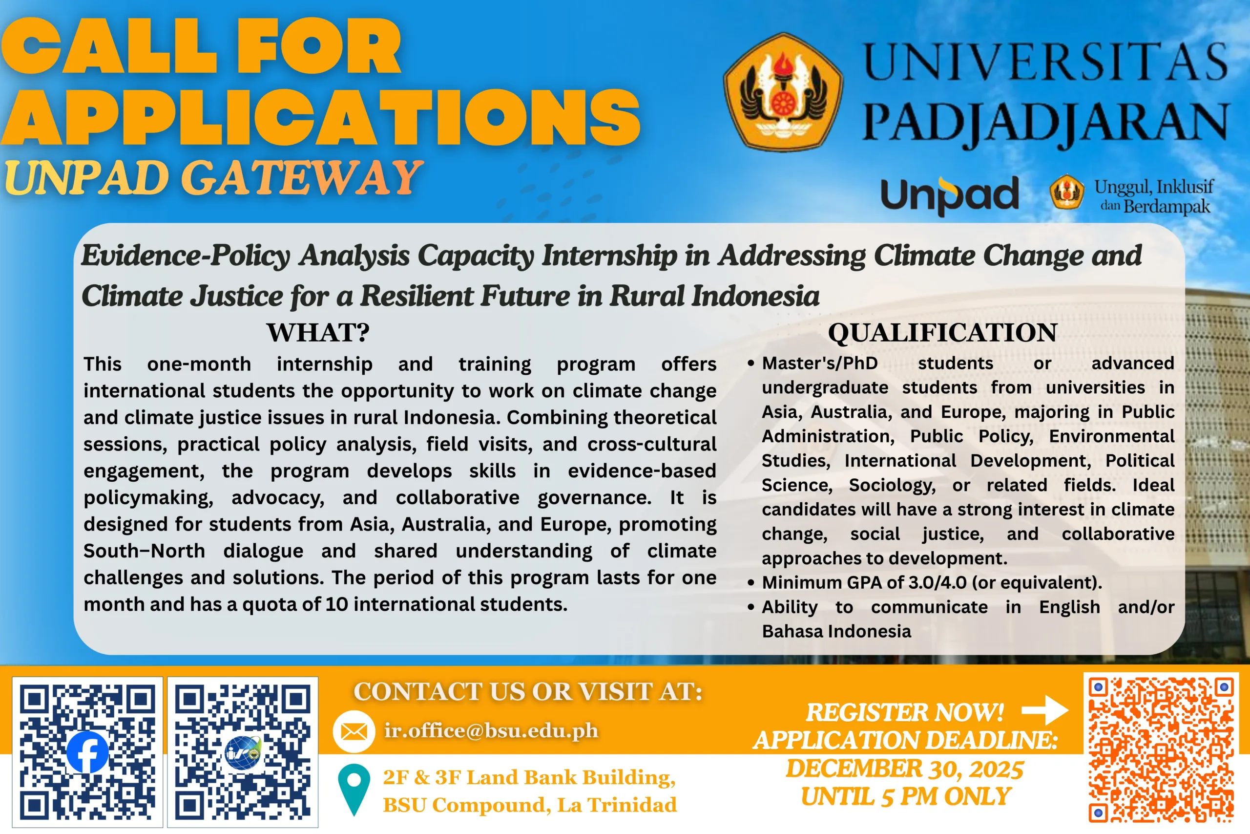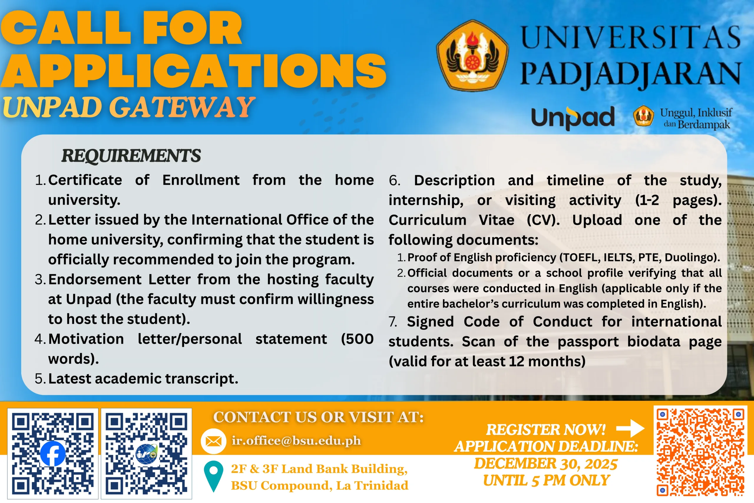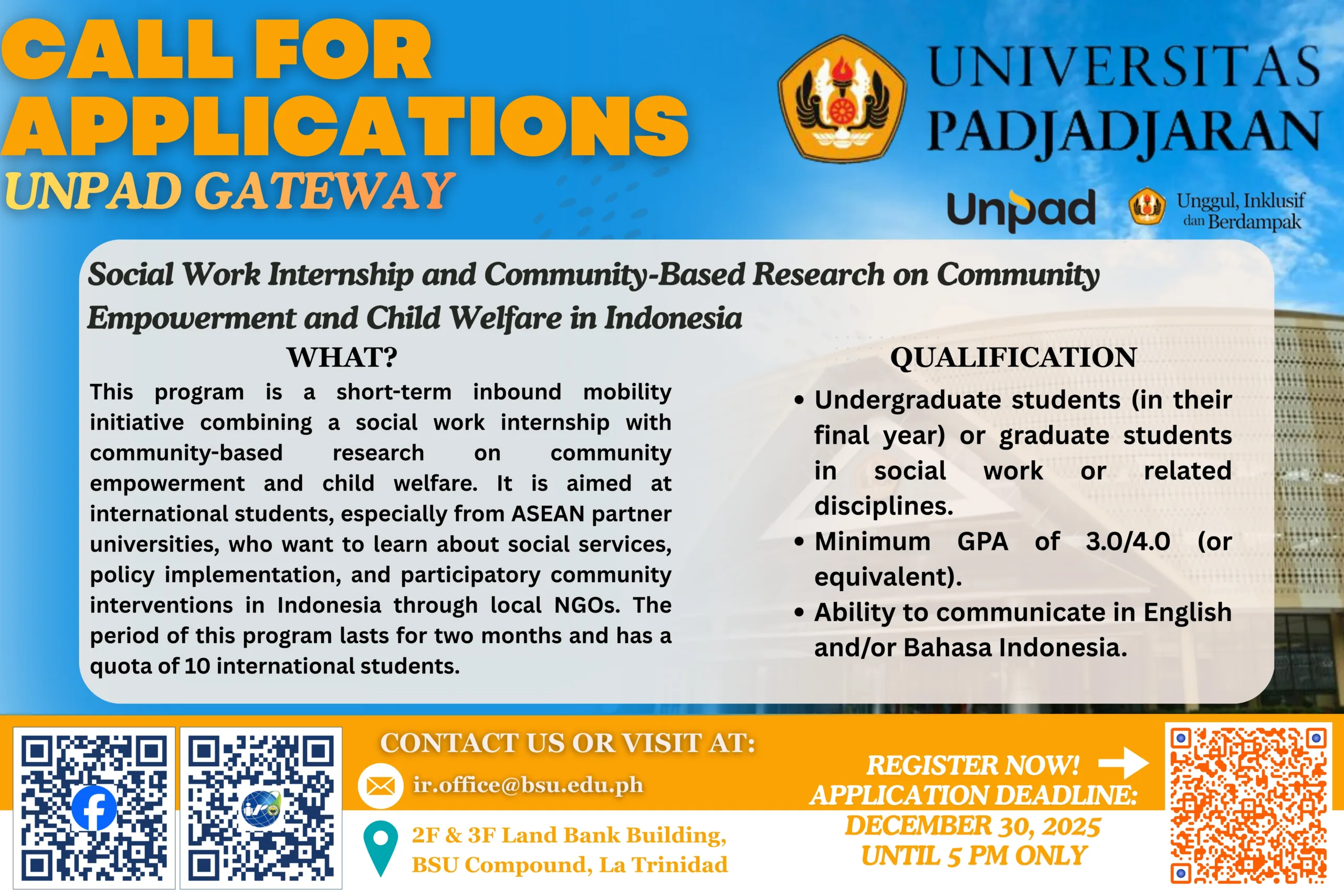 December 11, 2025We are pleased to share information on the Unpad Gateway, which provides accommodation grants for international students participating in short courses, internships, or short-term academic visits at Universitas Padjadjaran. This opportunity supports inbound non-degree activities with a duration of 1 to 2 months.