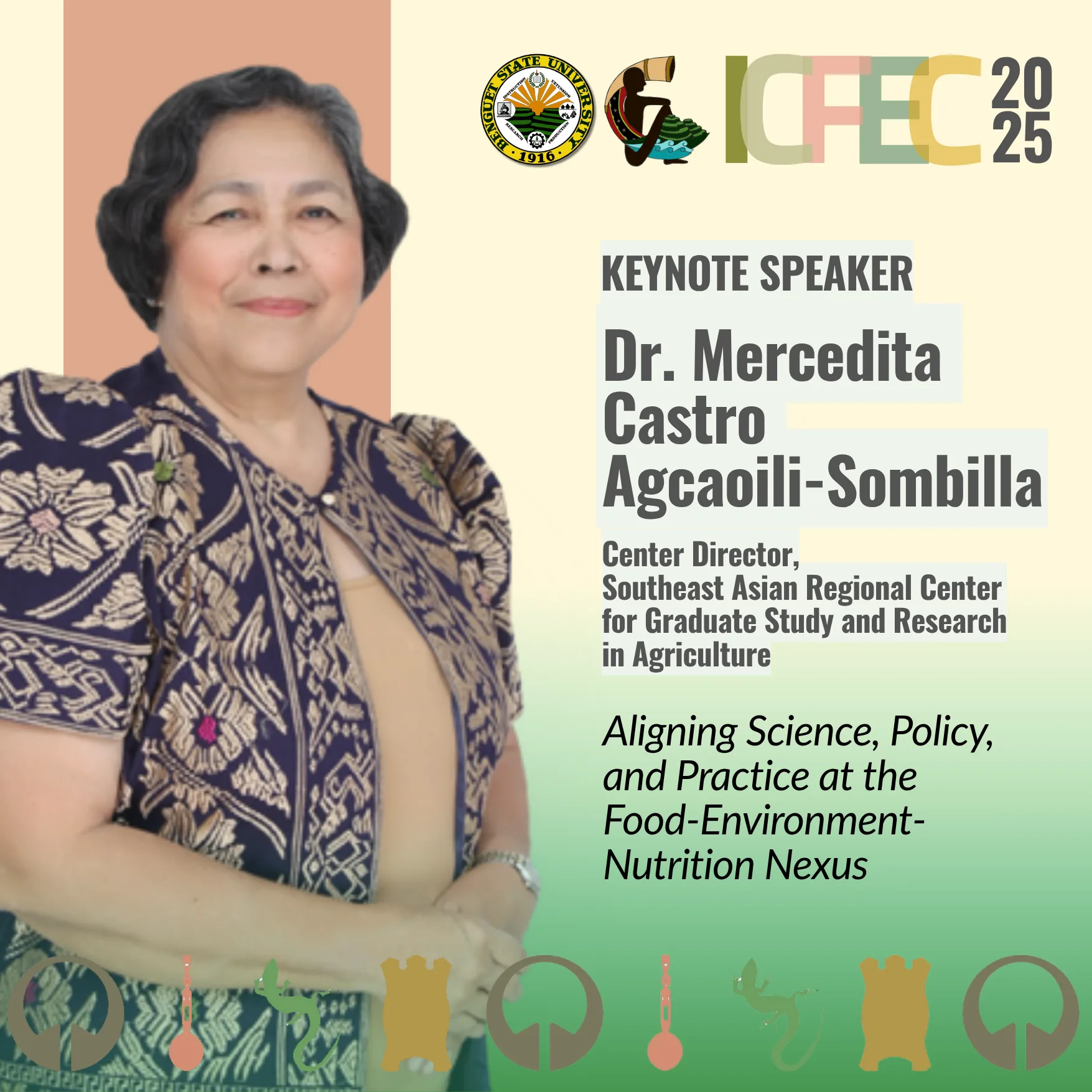 We proudly announce our KEYNOTE SPEAKER, Dr. Mercedita Castro Agcaoili-Sombilla, Center Director of SEARCA! Her powerful keynote address, “Aligning Science, Policy, and Practice at the Food-Environment-Nutrition Nexus,” will set the stage for the entire conference. A must-see! #ICFEC2025 #KeynoteSpeaker