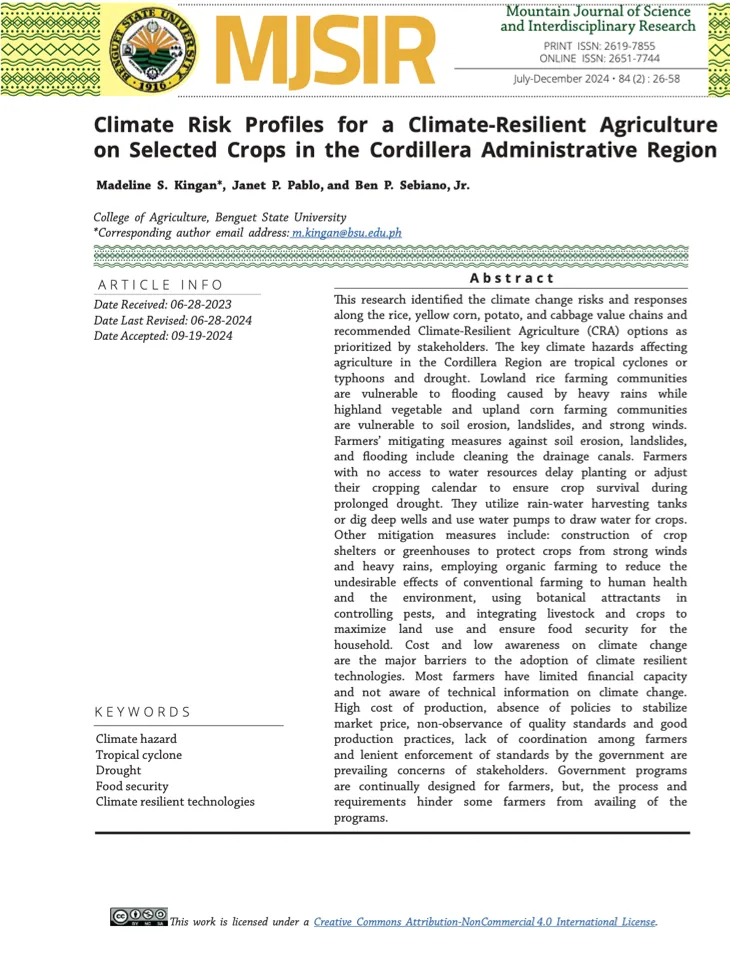 Benguet State University’s researches such as a published study on the Climate Risk Profiles For Climate-Resilient Agriculture on Selected Crops in the Cordillera Administrative Region (Figure 9) offers evidence-based insights that guide policy, resource allocation and governance in the region. This study analyzed vulnerabilities of key crops like rice, corn and highland vegetables to climate hazards such as heavy rains and temperature shifts, offering data-driven recommendations for resilient practices, including drought-resistant varieties, agroforestry and sustainable land management. By disseminating these findings through government reports and stakeholder workshops, policymakers are empowered to allocate resources effectively, integrate climate risks into national development plans, and enhance adaptive governance. This initiative ensures accountability, fosters informed decision-making, and contributes to global transparency efforts, with progress monitored via biennial updates and impact evaluations aligned with international reporting standards.
