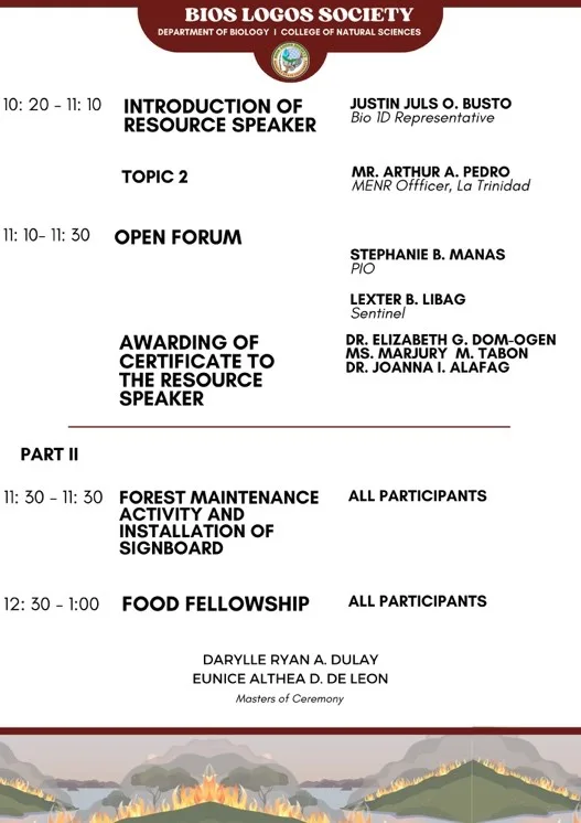 Benguet State University conducted local education programs to promote climate awareness and resilience among students and the community. The College of Natural Sciences and the Young Environmentalists’ Society organized a Youth Leadership Training (Figure 5) to enhance student leadership in environmental management and climate action, with sessions led by representatives from the local government and Municipal Environment and Natural Resources Office (MENRO).