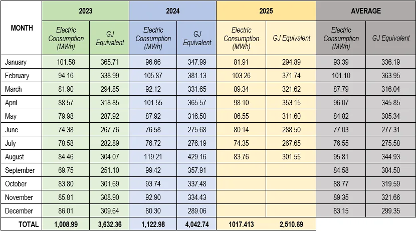 Indirect (Low-Energy) CO2 Emissions. The university used 1,008.99 MWh or 3,632.36 GJ of electrical energy in 2023 and 1,123 MWh or 4,043 GJ in 2024 while projected to be 1,017 MWh or 3,663 GJ in 2025. The monthly electric consumption varies at 70-119 MWh with generally greater values in January to February then gradually decreases in the succeeding months except in 2024 where the electric consumption spiked in August-September. The total electric consumption of the university was equivalent to 954.50 Mg CO2 emission in 2023 that increased to 1062.34 in 2024 but is now projected to decreased to 962.47 this 2025.