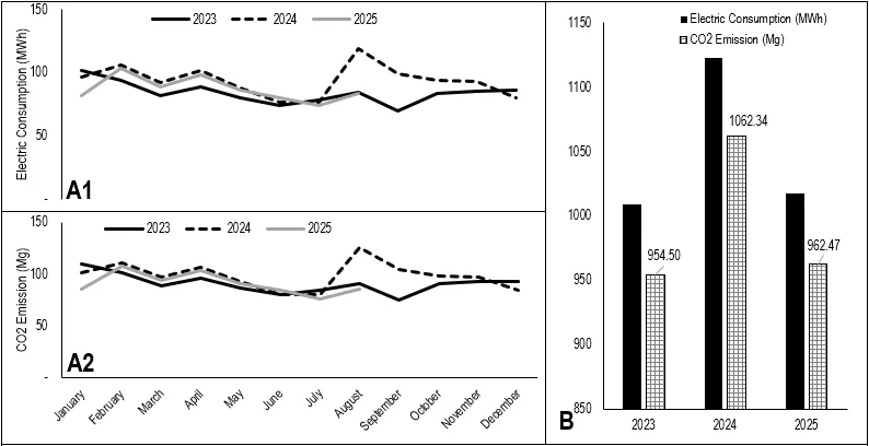 The university used 1,008.99 MWh or 3,632.36 GJ of electrical energy in 2023 and 1,123 MWh or 4,043 GJ in 2024 while projected to be 1,017 MWh or 3,663 GJ in 2025. The monthly electric consumption varies at 70 – 119 MWh (Figure 1A and Table 1) with generally greater values in January to February then gradually decreases in the succeeding months except in 2024 where the electric consumption spike in August-September. The total electric consumption of the university was equivalent to 954.50 Mg CO2 emission in 2023 that increased to 1062.34 in 2024 but is now projected to decreased to 962.47 this 2025 (Figure 1B). The huge increase in 2024 could be attributed to the increased student intake who had to consume more electricity for their classes, research and extension activities while the projected decrease this year is attributed to the initiatives to save resources and minimize wastage.