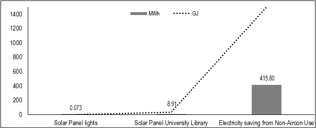 Direct (Low-Energy) CO2 Emissions. The university is slowly but steadily going towards low carbon energy sources such as the installation of solar-powered outdoor lights along the campus road and the solar panel in the University Library. The annual total energy generation from the solar lights is estimated at 73 KWh/yr or 0.26 GJ/yr while the 10 solar panel unit in the University Library generates 8.91 MWh or 32.08 GJ/yr. Additionally, the university is located in a highly elevated valley with semi-temperate climate and hence are not using air conditioning units results to saving electricity amounting to 415.8 MWh or 1,496.88 GJ per year.