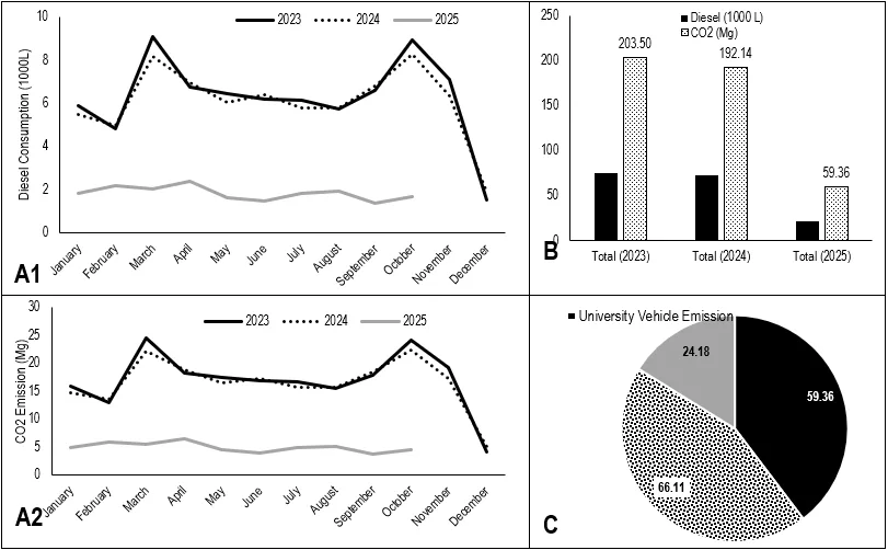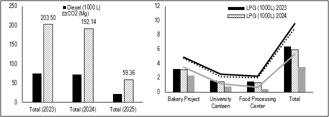 Direct (Non-Low-Energy) CO2 Emissions. The university maintains a fleet of vehicles mainly for local travel to fulfill its four-fold function, namely instruction, research, extension and production. The total diesel consumption of the university for year 2023 is 75,137 L equivalent to 203.50 Mg CO2, 72,828 L or 192.14 Mg CO2 in 2024 and projected to be much lower in 2025 at 21,918 L or 59.36 14 Mg CO2. In 2025, the emission from the vehicle and motorcycle of employees and students was included estimated at 24,408 L or 66.11 14 Mg CO2 for vehicles and 8,928 L or 24.18 Mg CO2 for motorcycles. In total, the estimated fuel consumption of the university is 55,254.55 L equivalent to 149.65 Mg CO2 emission in 2025.