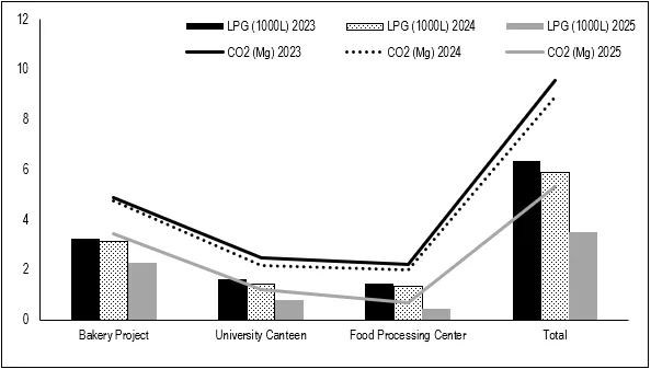 Another energy consumption of the university is the use of liquid petroleum gas (LPG) in the canteen, bakery and food processing centers being maintained by the university. The total LPG used for year 2023 is 6,335 L which is equivalent to 9.57 Mg CO2 emission (Figure 4) while 5,900 L equivalent to 8.91 Mg CO2 emission in 2024. This decreased to 3,518 L in 2025 equivalent to 5.31 Mg CO2 emission.