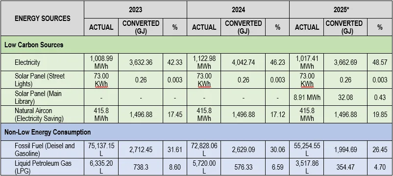 The total energy used by Benguet State University was 8,580.26 GJ in 2023, 8,745.31 GJ in 2024 and 7,541.06 GJ in 205. Out of this, the amount of low carbon energy (electricity, solar panel and energy saved due to non-use of aircon) used was 5,129.51 GJ in 2023, 5,539.88 in 2024 and 5, 159.83 in 2025 contributing to 60%, 63% and 68%, respectively on the total university’s energy use.