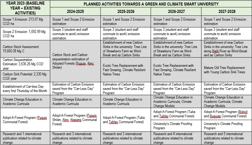 Benguet State University drafted and is implementing a climate action plan (Table 4) commencing from being a Carbon Sink University and now moving towards a Green and Climate Smart University. This climate action plan is focused in maintaining and possibly enhancing its capacity as a carbon neutral and a carbon sink. To achieve this, among its plans are continuous monitoring of its carbon emission, stock and sequestration; continuation of its car-less day every first Thursday of the Month and monitoring of its effects on carbon emission; maintaining and enhancing climate change education in academic curricula; continuation and enhancement of extension programs, projects and activities related to climate action such as the Adopt-a-Forest program; and implementation and publication of researches on climate change.
