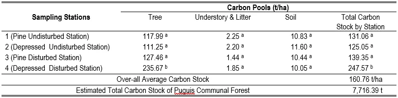 On the other hand, the estimated carbon stock of Puguis Communal Forest (Figure 16, Table 5) had tree containing the highest carbon followed by soil and least in the understory and litter. Station 4 had the significantly highest tree carbon stock at 235.67 t/ha while much lower in Station 3 with 127.46 t/ha, Station 1 with 117.99 t/ha and lowest in Station 2 at 111.25 t/ha-1. Consequently, Station 4 had the highest total carbon pool at 247.57 t/ha while the other stations had 125.05 – 139.16 t/ha. Understory & litter carbon ranged from 1.44 – 2.25 t/ha with higher values in undisturbed stations (1 and 2) but did not differ significantly between stations. On the other hand, soil carbon ranged from 10.05 – 11.60 t/ha and did not differ significantly between stations. Station 4 had the lowest soil carbon while undisturbed stations (1 and 2) had higher values. The carbon stock between the sampling stations averaged at 160.76 t/ha and multiplying that with the total area of the forest, the total carbon stock of Puguis Communal Forest was estimated at 7,716.39 t.
