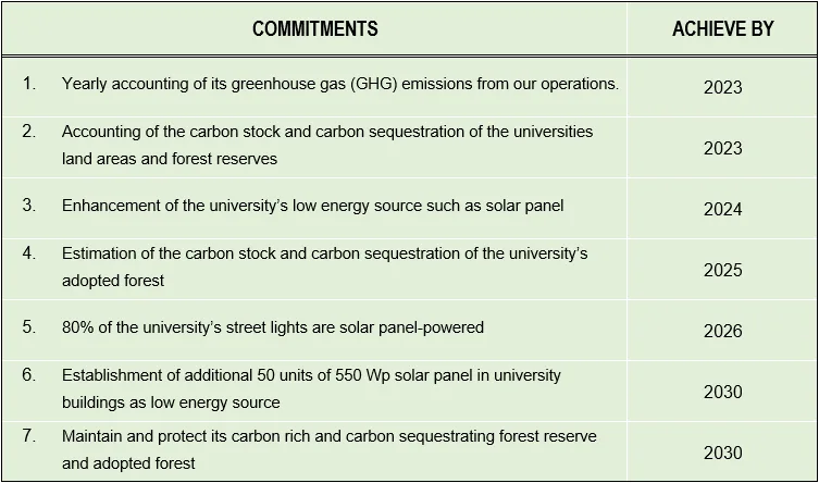 In 2023, Benguet State University is more than just a carbon neutral but instead is already a CARBON SINK university. To maintain and possibly enhance its capacity as a carbon neutral and a carbon sink, the university commits to:
