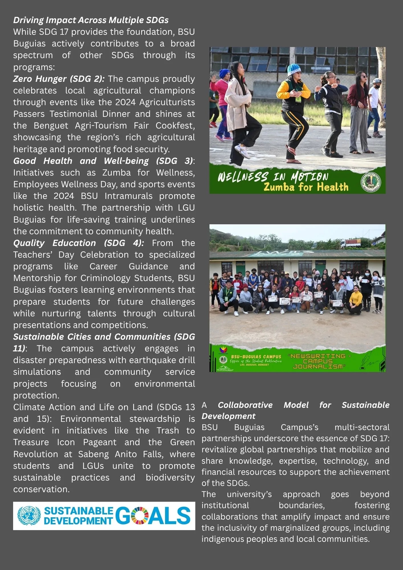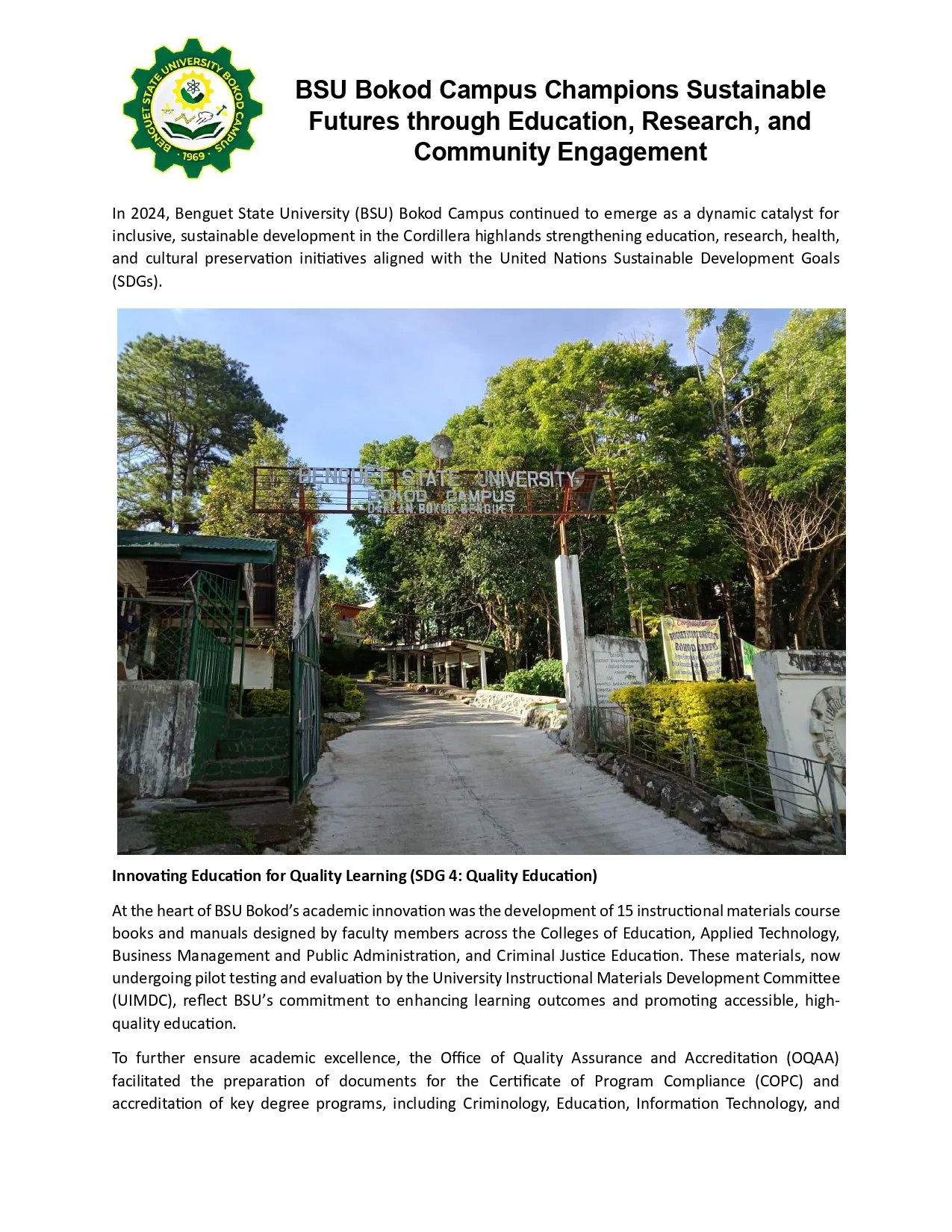 - Sustainable Agriculture Data: The Northern Philippines Root Crops Research and Training Center (NPRCRTC) represented BSU at the 4th AsiaBlight International Meeting in Chengdu, China (November 2024). The BSU representatives presented research findings on potato late blight management in Benguet dating back to the 1980s. This participation fulfills the requirement for international collaboration on gathering data essential for SDG 2 (Zero Hunger) research.