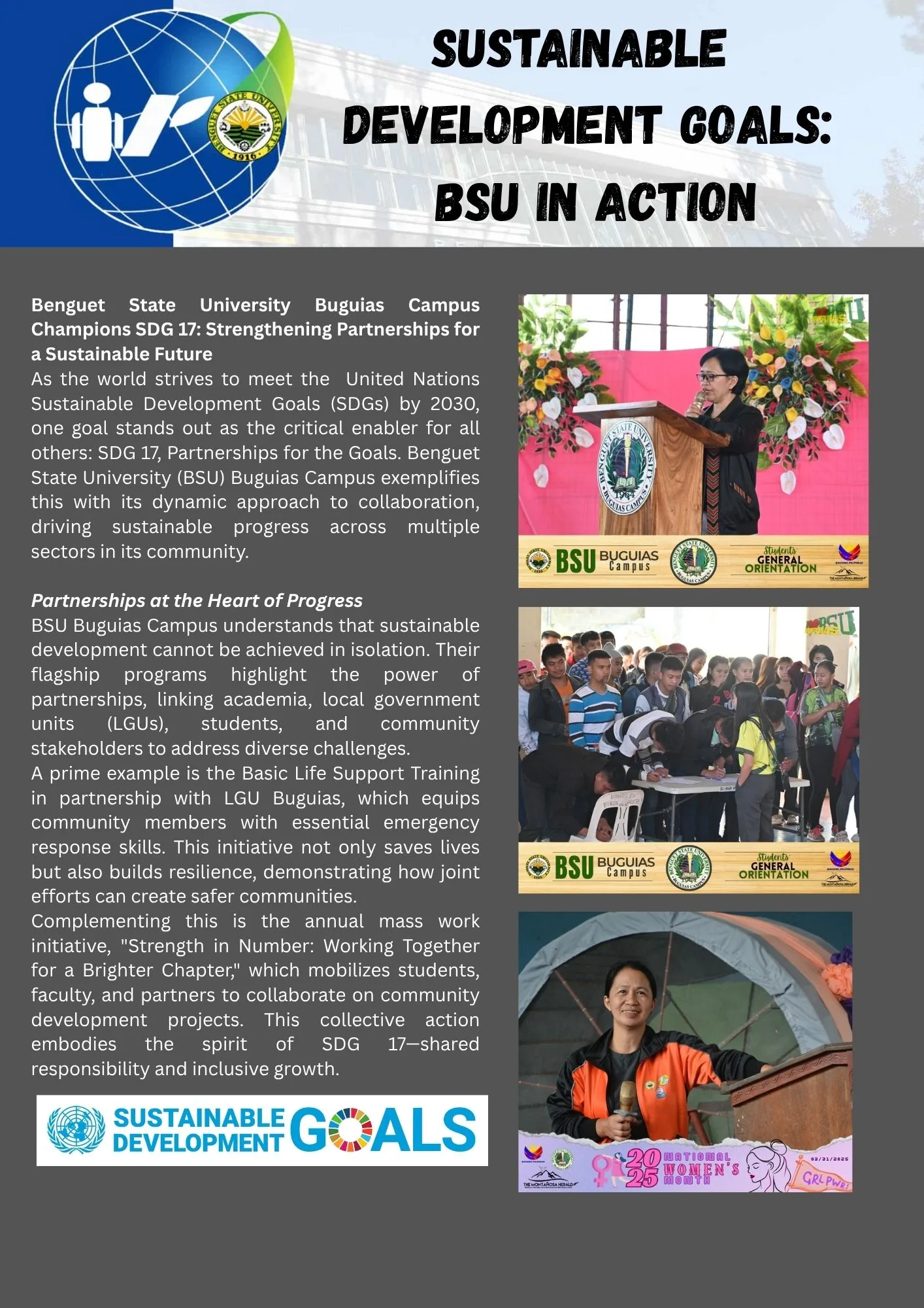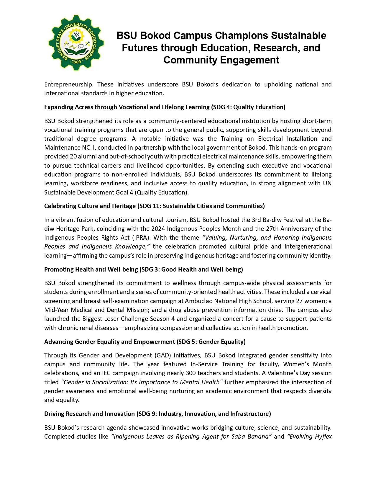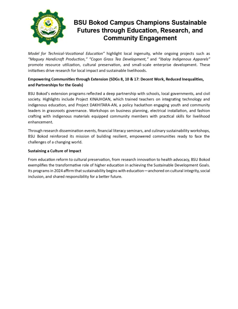 - Training on National Legislation: BSU’s Gender and Development (GAD) Office concluded its 18-Day Campaign to End Violence Against Women (VAW) (November 25 – December 12, 2024) by hosting a crucial training-forum on the Safe Spaces Act (RA 11313). This event included participation from the Commission on Higher Education-Cordillera Administrative Region (CHED-CAR). The GAD Focal Person for CHED-CAR emphasized the critical importance of integrating gender perspectives into university policies, programs, curricula, and research. This initiative serves as clear evidence of BSU acting as an institutional intermediary, ensuring the translation of national SDG 5 (Gender Equality) policy into regional higher education operations, thereby supporting SDG 16 (Peace and Justice) and SDG 17 goals regarding policy input.